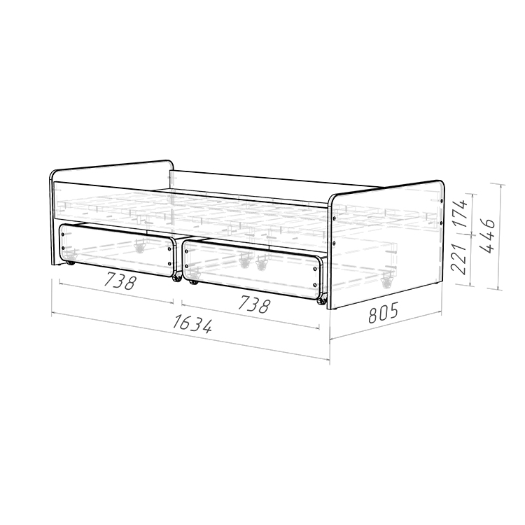 3. Удобство хранения: Кровать оснащена двумя выкатными ящиками на колесиках, которые предоставляют дополнительное место для хранения игрушек, постельного белья или других вещей, что особенно актуально в небольших детских комнатах.