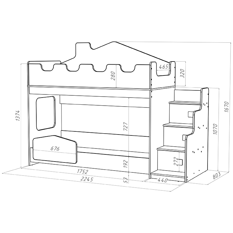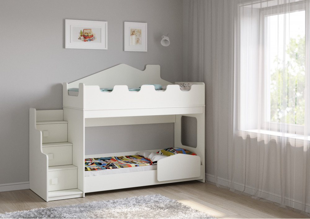 Угловая лестница с тремя дверками обеспечивают легкий и безопасный доступ ко второму этажу и дополнительные места хранения. Нижний ярус оснащен безопасным бортиком – для дополнительного комфорта и безопасности вашего ребенка. Световые окна по бокам создают уютную атмосферу и могут быть использованы для наблюдения за звездами прямо с кровати. Наконец, мягкие углы и кант делают эту кровать безопасной для использования, предотвращая возможность травм.