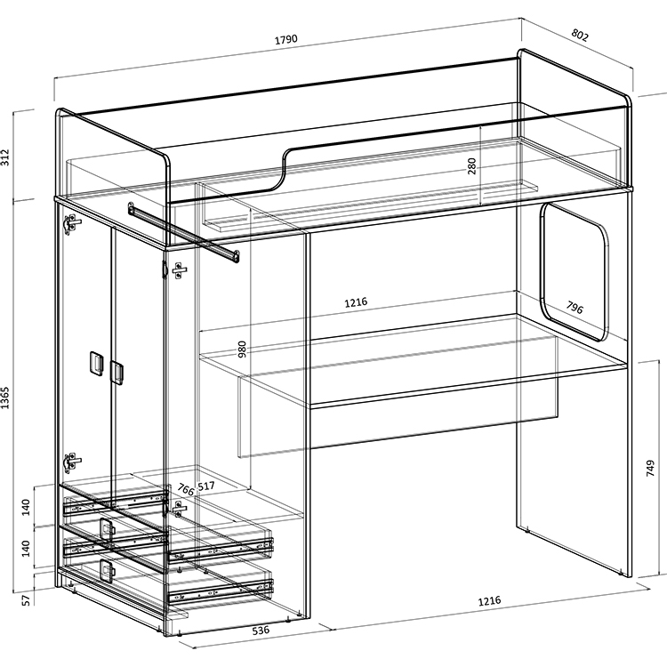 Учебная зона со столом под спальным местом открывает возможности для письменных работ,а также здесь удобно расположить ноутбук.