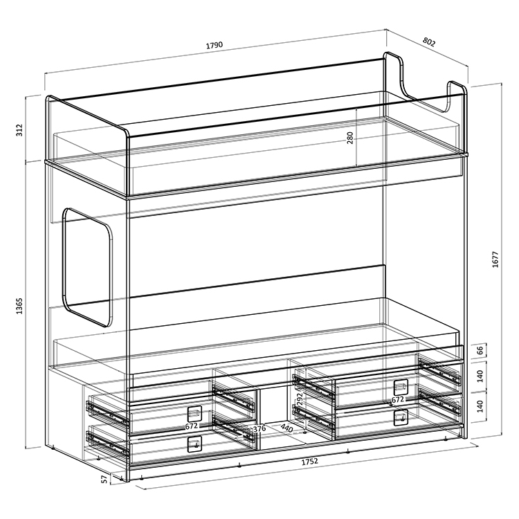 Под нижним ярусом раполагаются 4 выдвижных ящика. Теперь у каждого ребенка есть свои места хранения вещей и игрушек.